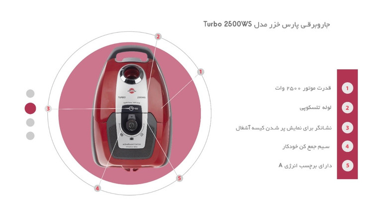 جاروبرقی پارس خزر مدل Turbo 2500WS با طراحی مدرن و کاربر پسند، توانسته است جایگاه ویژهای در بازار پیدا کند. ابعاد این جاروبرقی 470*270*210 میلیمتر و وزن آن ۵.۴ کیلوگرم است که امکان حمل و نقل آسان را فراهم میکند. این جاروبرقی دارای سه چرخ است که به راحتی میتوان آن را در هر جهتی حرکت داد و به نقاط مختلف خانه دسترسی پیدا کرد. یکی از ویژگیهای برجسته این مدل، سیم جمع کن خودکار است که به کاربران اجازه میدهد به راحتی کابل برق را پس از اتمام کار جمع کنند. این ویژگی نه تنها به نظم و ترتیب محیط کمک میکند، بلکه از آسیب دیدن کابل نیز جلوگیری میکند. لوله خرطومی این جاروبرقی با روکش کنفی ساخته شده است که دوام و استحکام بالایی دارد و مانع از پیچخوردگی و ترکخوردگی لوله میشود. افرادی که به خرید جاروبرقی پارس خزر مدل turbo 2500wsپرداختهاند از خرید خود راضی هستند. جاروبرقی پارس خزر Turbo 2500WS با قدرت موتور ۲۵۰۰ وات، عملکردی بسیار قوی و موثر در تمیز کردن سطوح مختلف دارد. این جاروبرقی با استفاده از فناوری Quattro Power، توانسته است عملکرد بهینهای را در مصرف انرژی و کارایی بالا ارائه دهد. برچسب انرژی A این جاروبرقی نشاندهنده مصرف بهینه انرژی آن است که در عین قدرت مکش بالا، مصرف انرژی کمتری دارد. این جاروبرقی با شعاع عملکرد ۱۴ متر و طول کابل برق ۱۴ متر، امکان تمیز کردن فضای گستردهای را بدون نیاز به جابجایی مکرر پریز برق فراهم میکند. این ویژگی به ویژه برای خانههای بزرگ و فضاهای وسیع بسیار مناسب است. با استفاده از این جاروبرقی، میتوانید به راحتی تمام نقاط خانه را تمیز کنید و از کارایی و عملکرد بالای آن لذت ببرید.