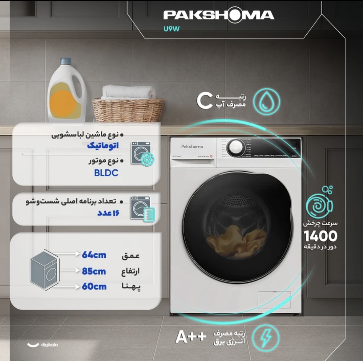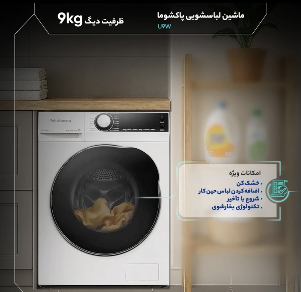 ماشين لباسشويى 9كيلوكَرم اتوماتيك پاكشوما مدل U-9 يكى از مدل هاى پيشرفته و خوش ساخت اين برند است كه با بهره كيرى از فناورى هاى مدرن، طراحى كاربردى و مصرف بهينه، كزينه اى مناسب براى خانواده هاى متوسط تا پرجمعيت به حساب مى آيد. اين دستكاه با بدنه آلومينيومى مقاوم توليد شده و طراحى درب از جلو با باز شدن به سمت جب، استفاده روزمره را سادهتر مى كند. ابعاد 80سانتى متر ارتفاع، 60 سانتى متر پهنا و 60سانتى متر عمق باعث مى شود محصول در اكثر فضاى استاندارد كابينتها بهراحتى جا بكَيرد. كنترل دستكَاه از تركيب دكمه هاى لمسى و سلكتور جرخشى انجام مى شود و نمايشكَر ديجيتال نيز وضعيت شستوشو، زمان باقى مانده و تنظيمات فعال را با وضوح مناسب نمايش مى دهد. قلب اصلى اين مدل، موتور BLDC است كه نسبت به موتورهاى تسمهاى مصرف انرزى كمترى دارد، صداى كمتر توليد مى كند و دوام بالاترى ارائه مى دهد. ميزان صداى 54 دسى بل نشان مى دهد كه دستكاه حتى هنكام شست وشو عملكردى كم صدا و آرام دارد.